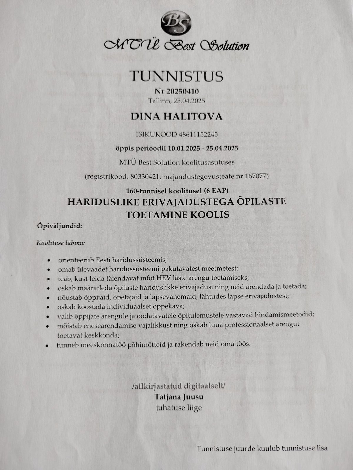 Lisaks täiendasin oma teadmisi sihipäraselt lühematel koolitustel, nagu neuropsühholoogiline lähenemine käekirja korrigeerimiseks, mänguteraapia algklassides, laste hüperaktiivsuse sotsiaalsed aspektid ning õpetajate emotsionaalse läbipõlemise ennetamine. Need koolitused aitasid mul paremini mõista õpilaste arengut ja toetamise võimalusi.