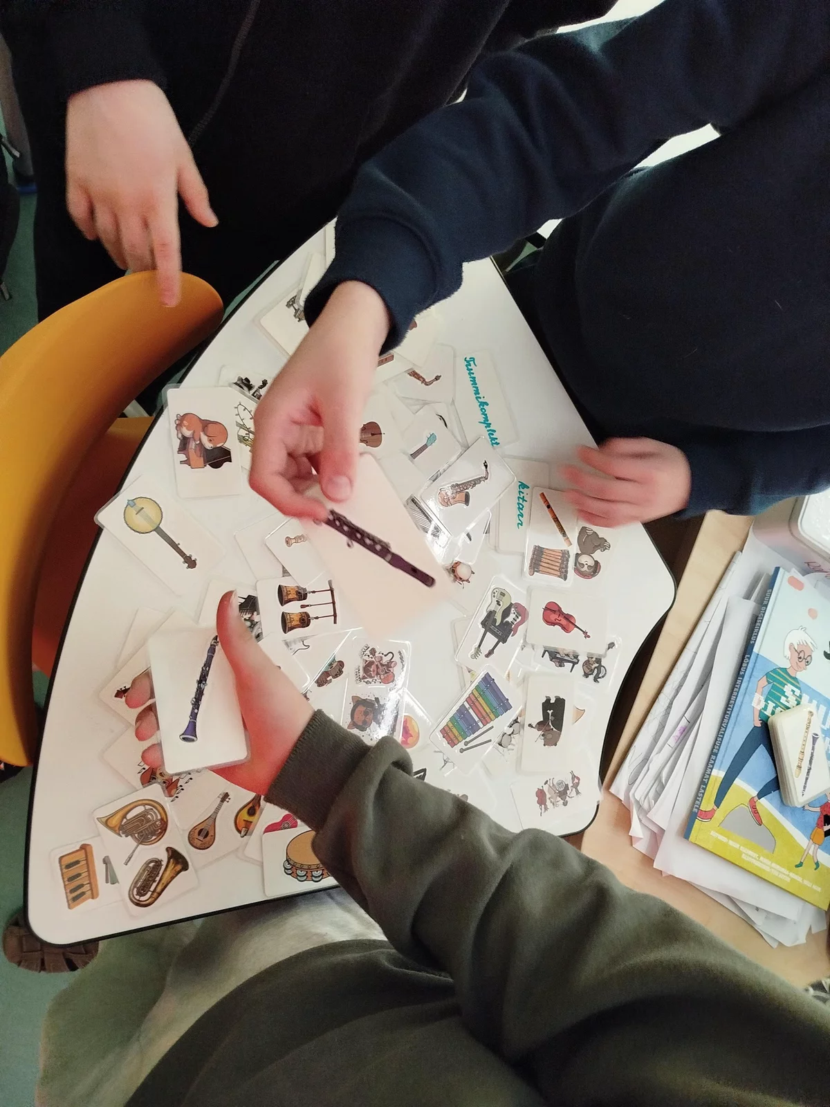 Практически я использую карточки с инструментами, где на одной стороне изображён инструмент, а на другой - соответствующее понятие. Ученики слушают музыкальное произведение, определяют звучащий инструмент и составляют предложения с помощью карточек. Такая деятельность объединяет навыки слушания, понимание понятий и языковое выражение.